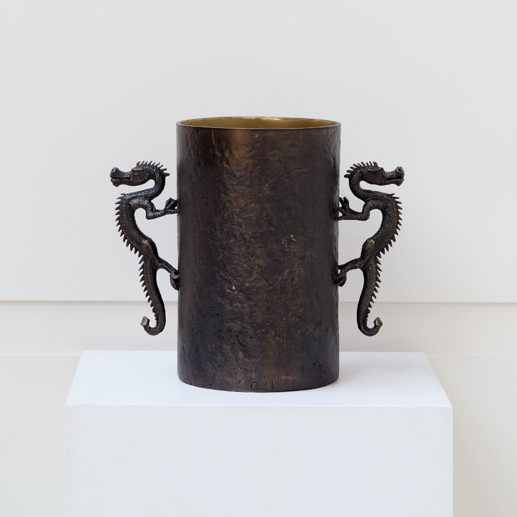Beige enameled ceramic sculpture in the shape of a stylised horse head.