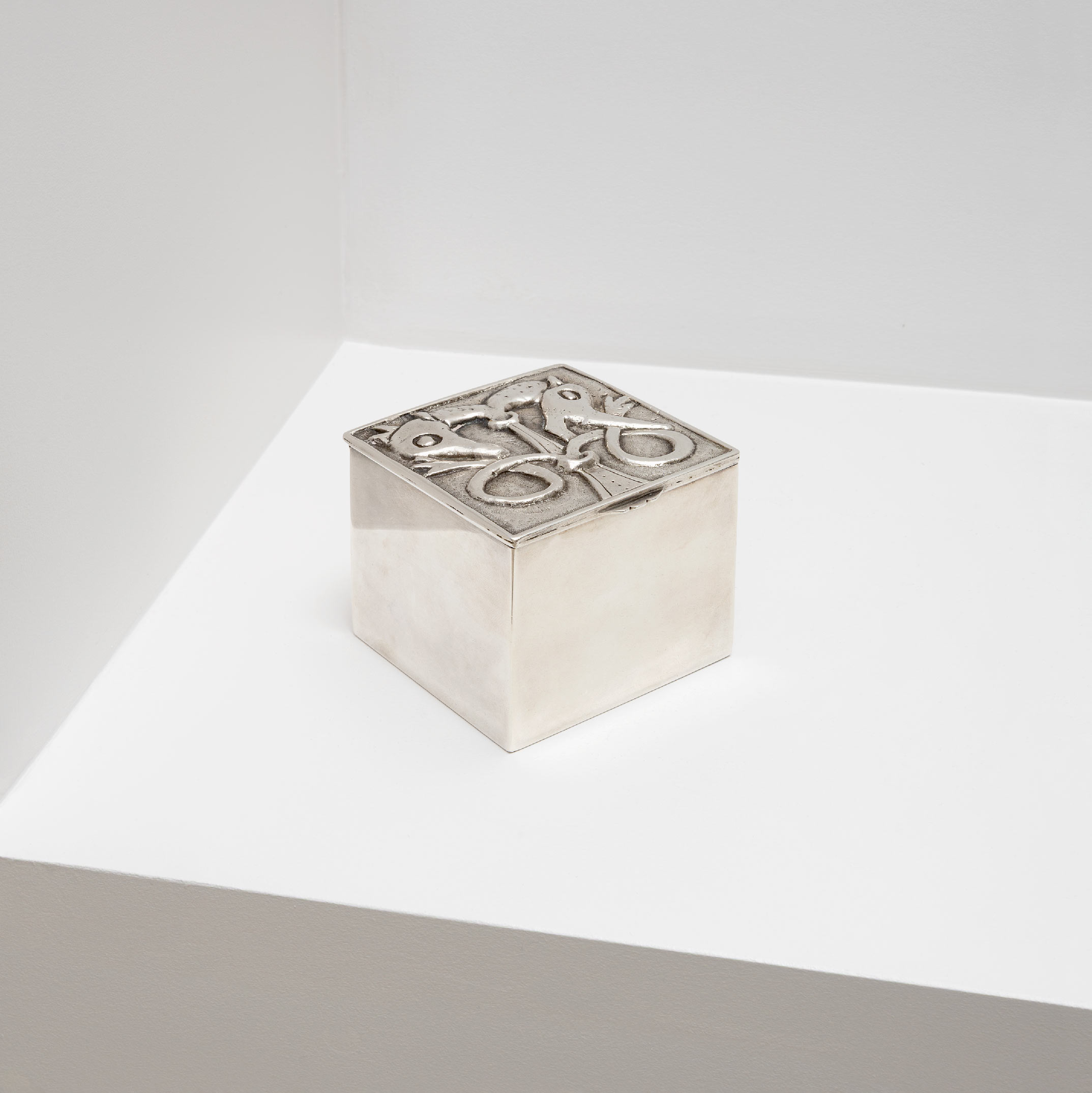 Important box in silvered bronze presenting a figure of wolf and a fox. Stamped « Line Vautrin » underneath.