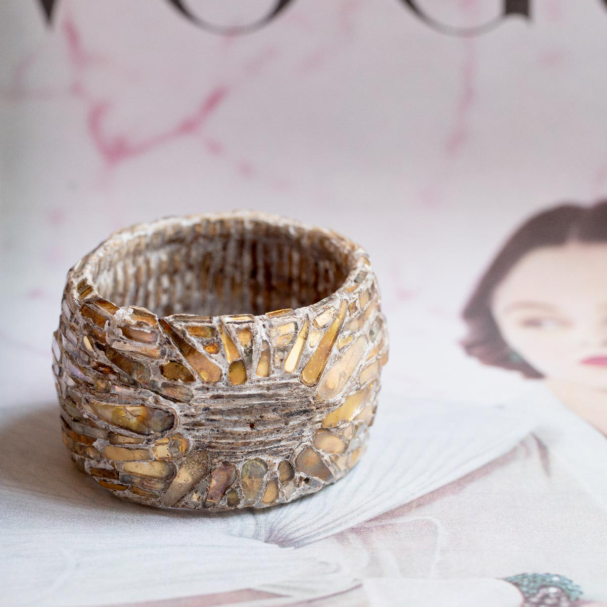 Beige talosel cuff bracelet inlaid with orange mirror strips affixed parallel to each other and forming a sun on top.
