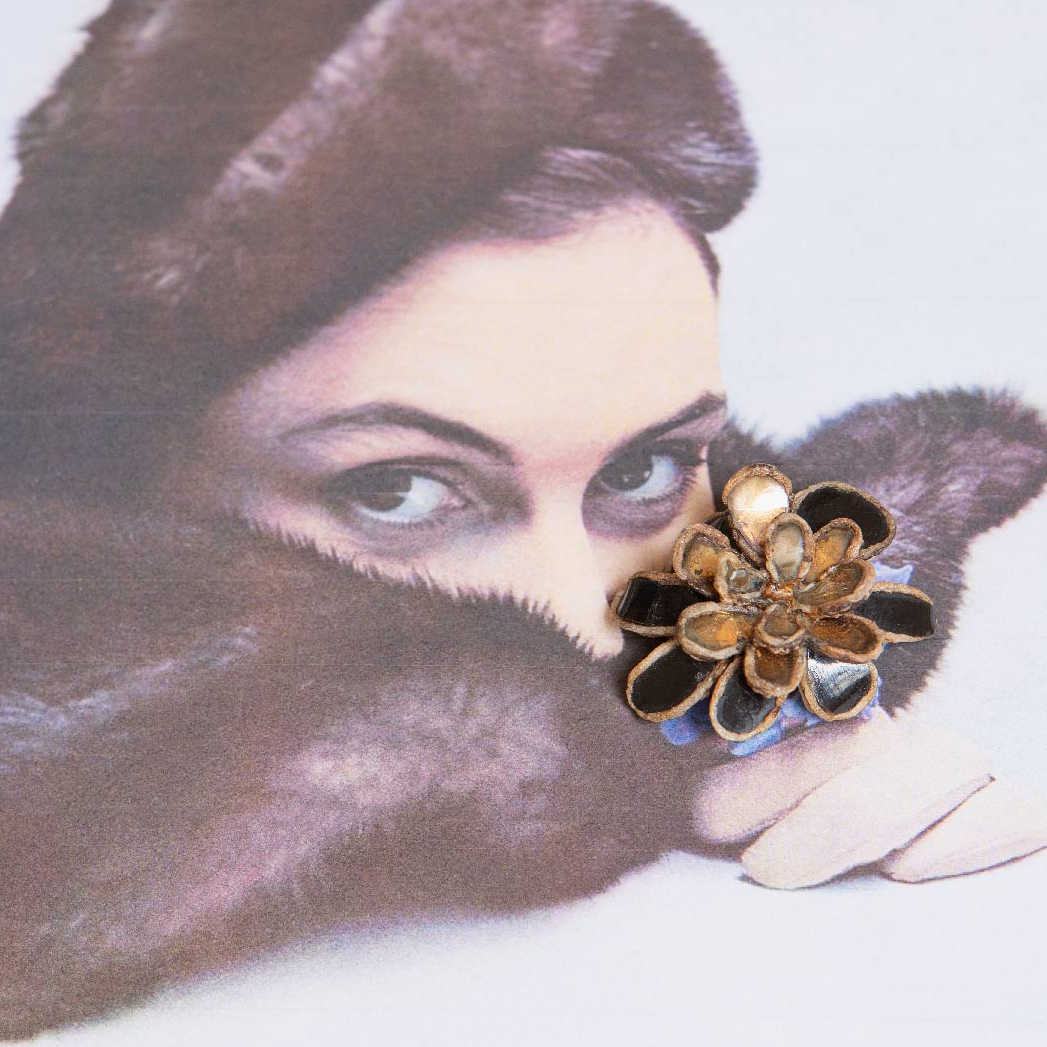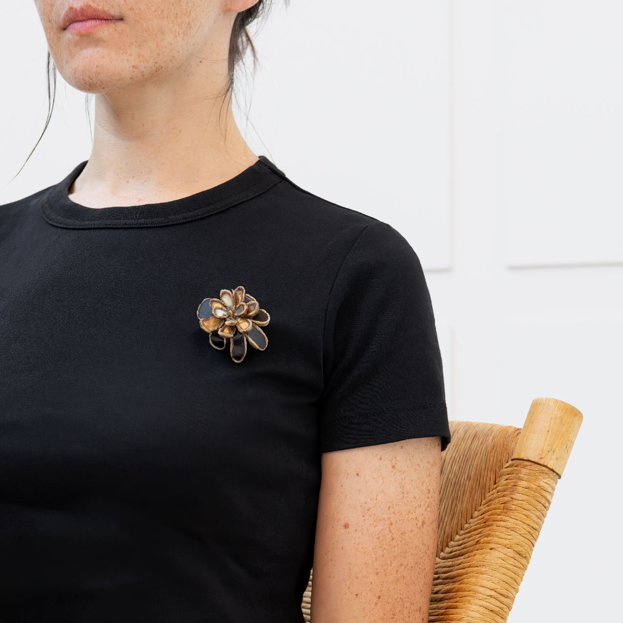 Beige talosel brooch in the shape of a flower composed of several petals set with black and amber mirrors. The talosel back is striated.