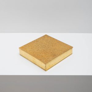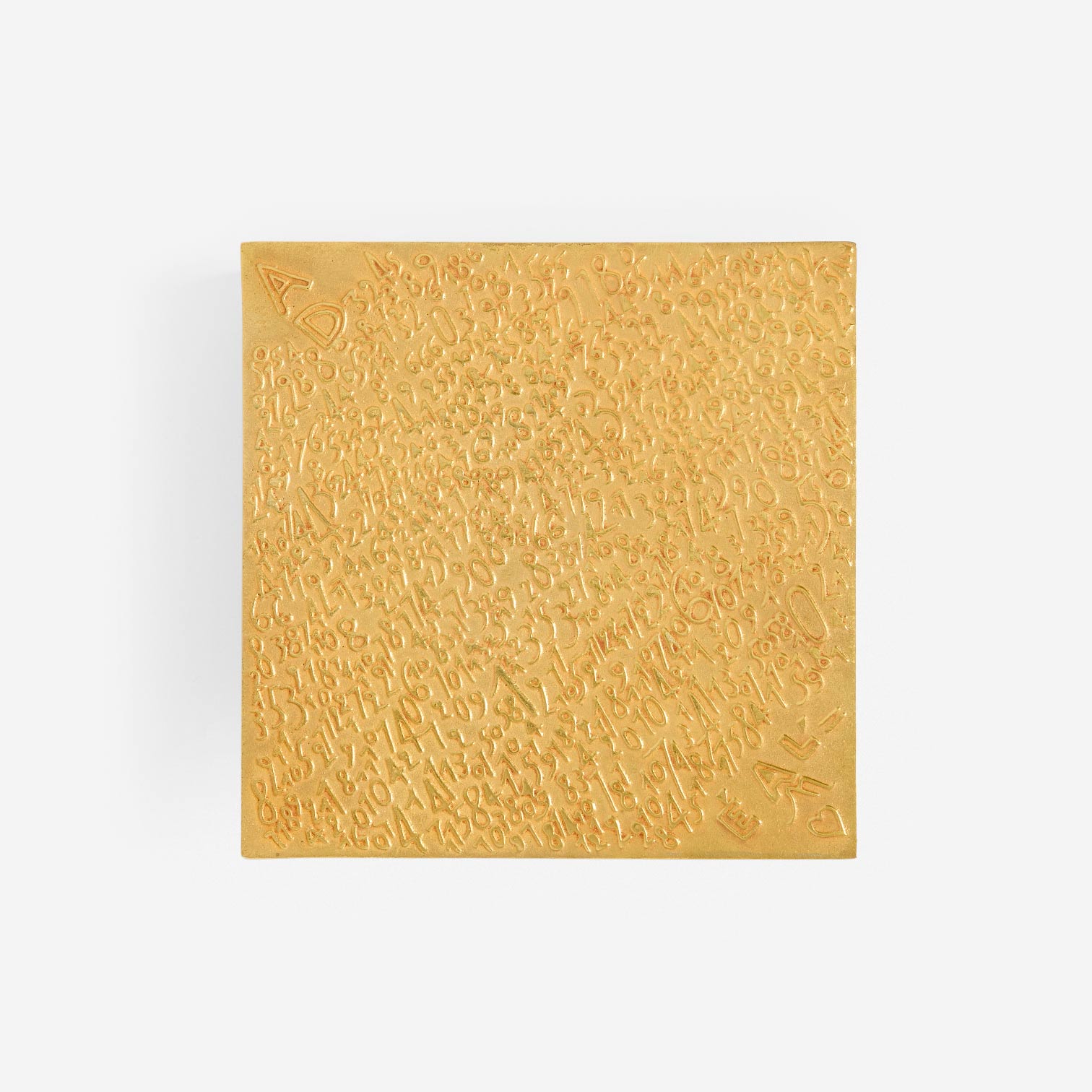 Boîte en bronze doré « A déchiffrer à l’égal de mon cœur » portant des inscriptions et des chiffres. Estampillée « Line Vautrin » en dessous.