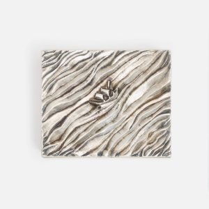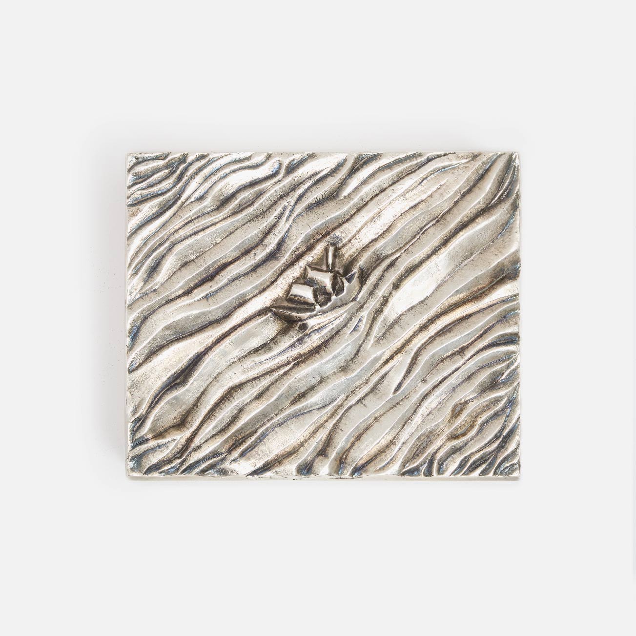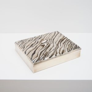 Importante boîte en bronze argenté présentant un bateau porté par les flots. L’intérieur du couvercle est gravé de poissons.