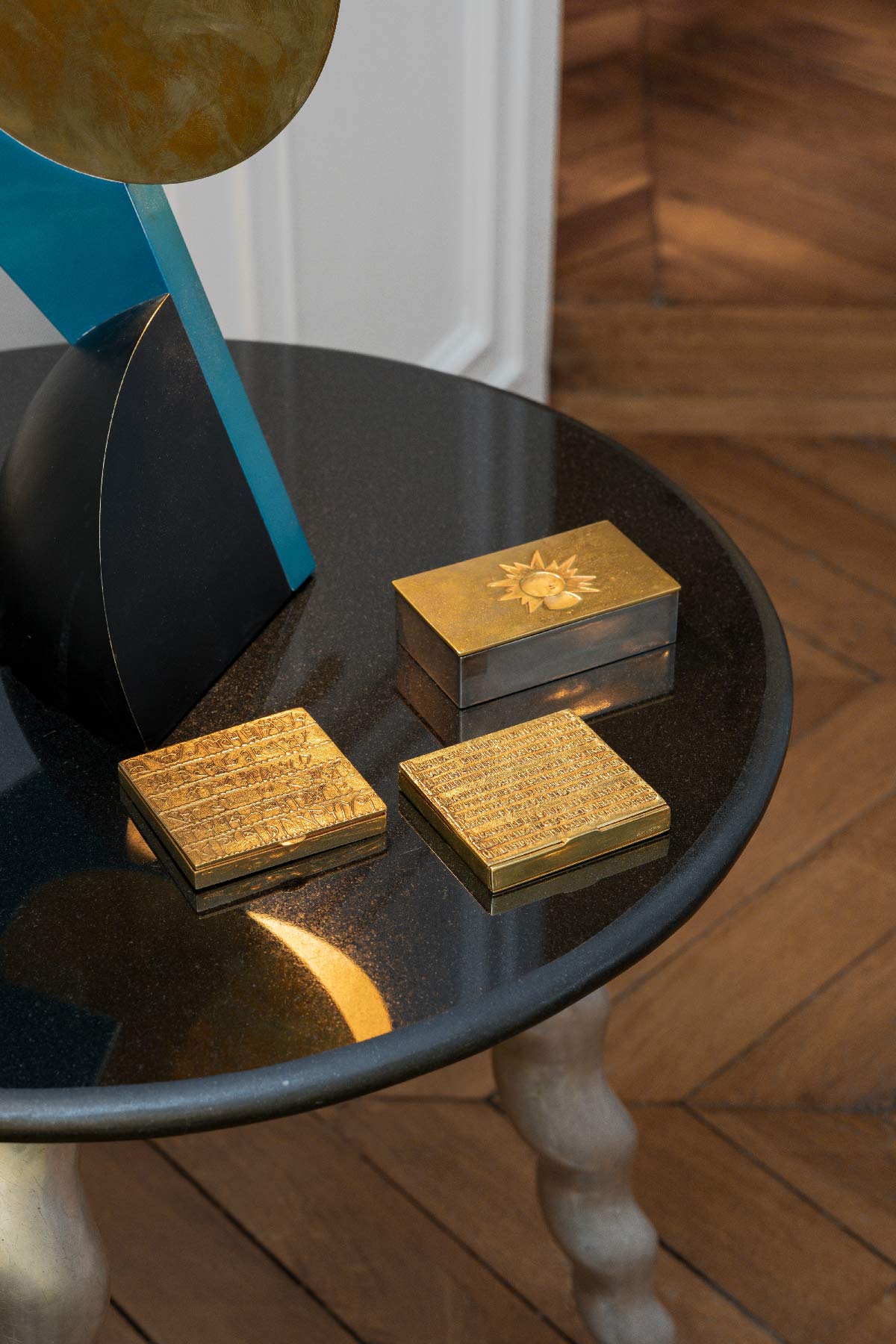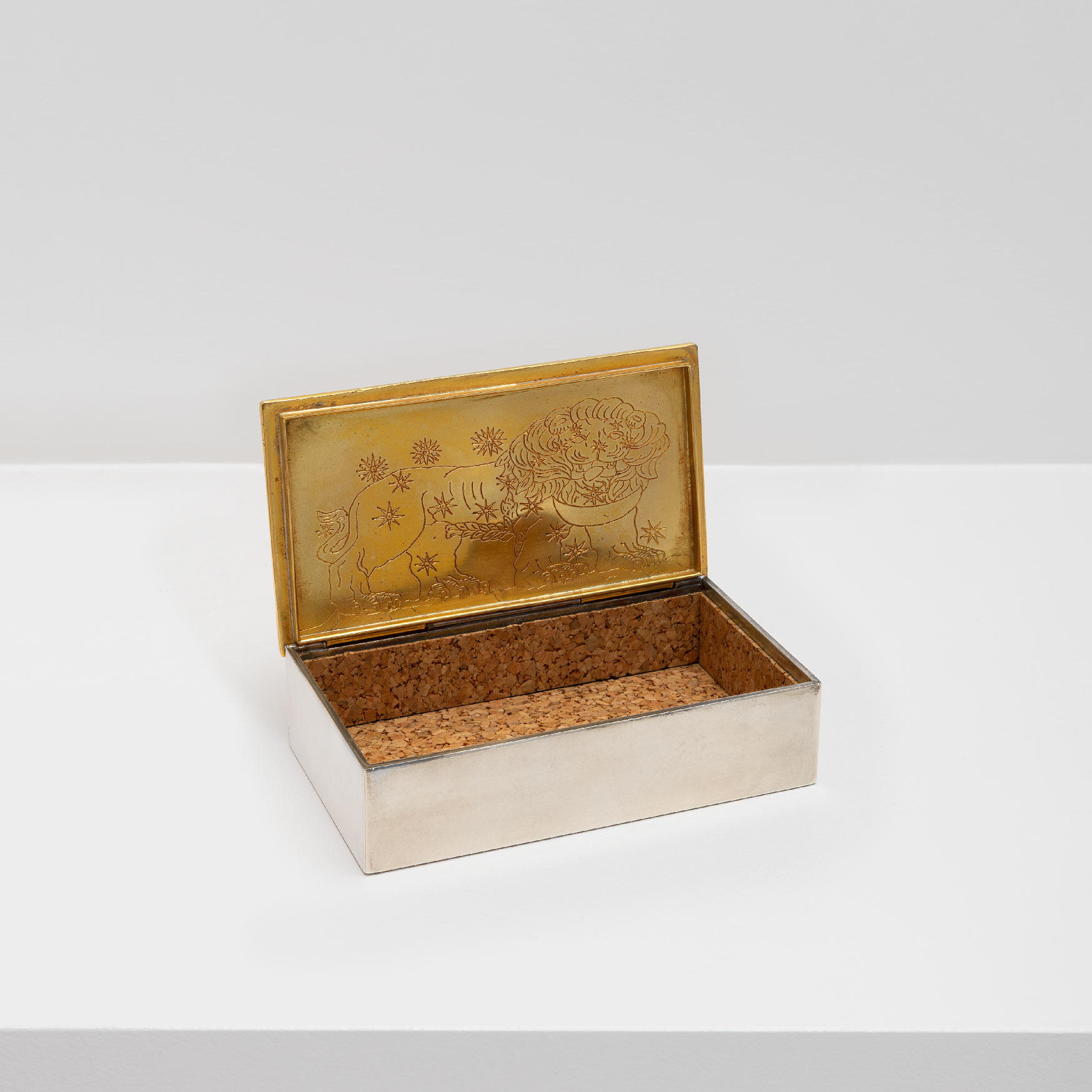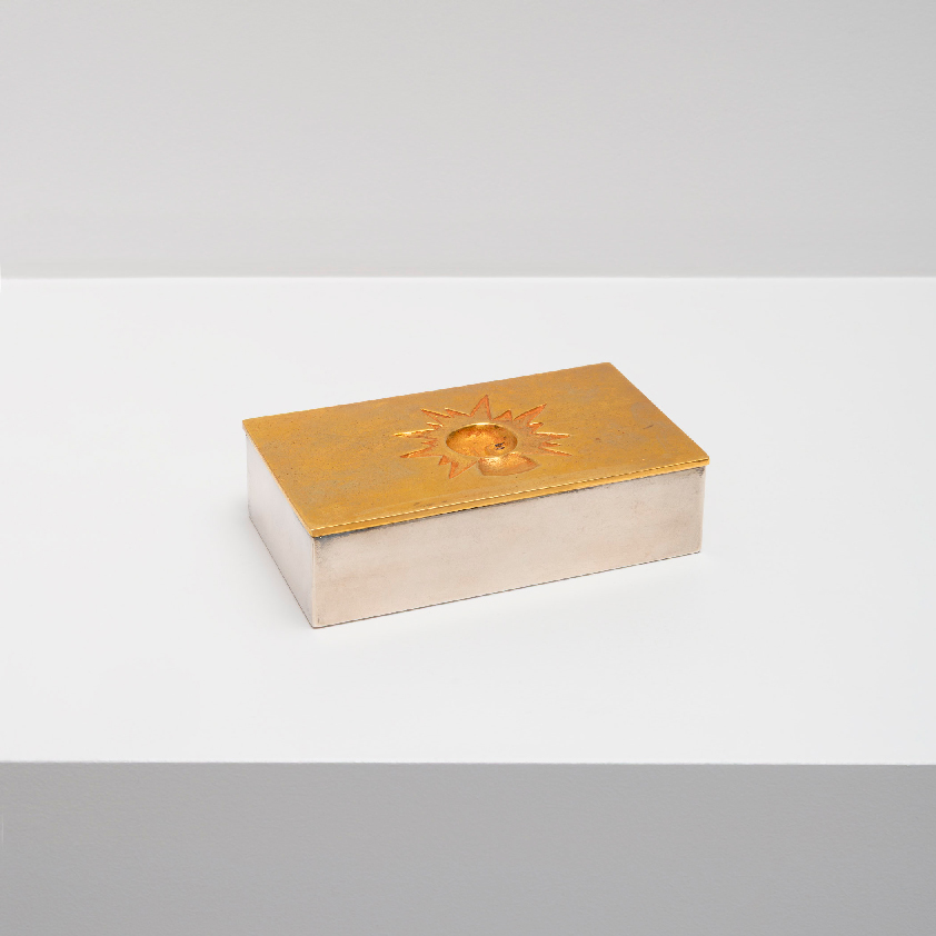 Boîte en bronze doré et argenté présentant sur le couvercle un Soleil doré et à l’intérieur un lion gravé.