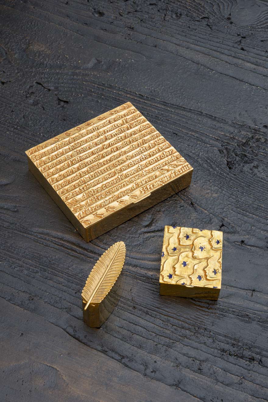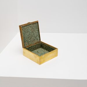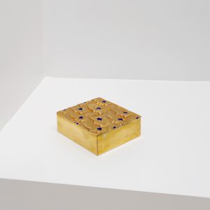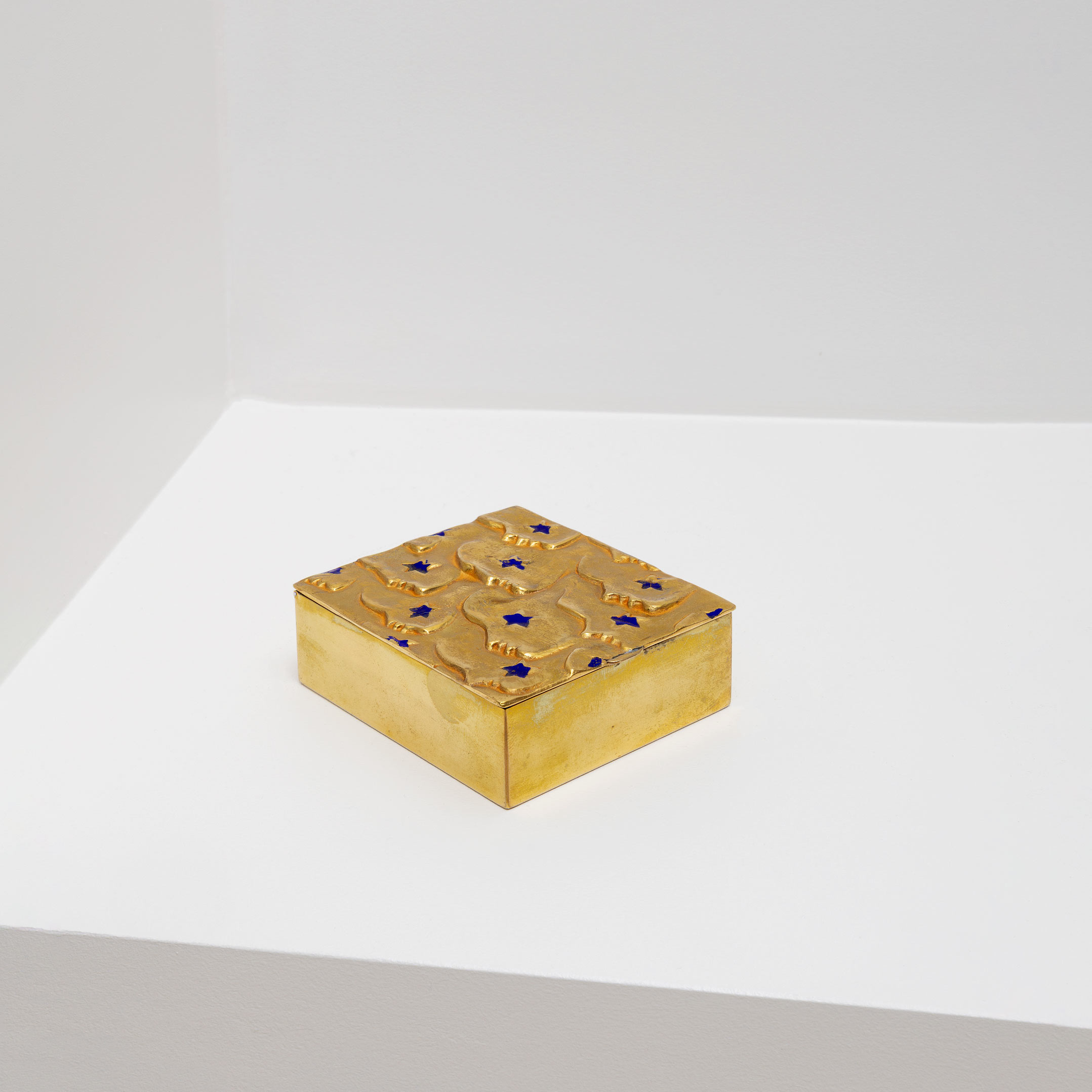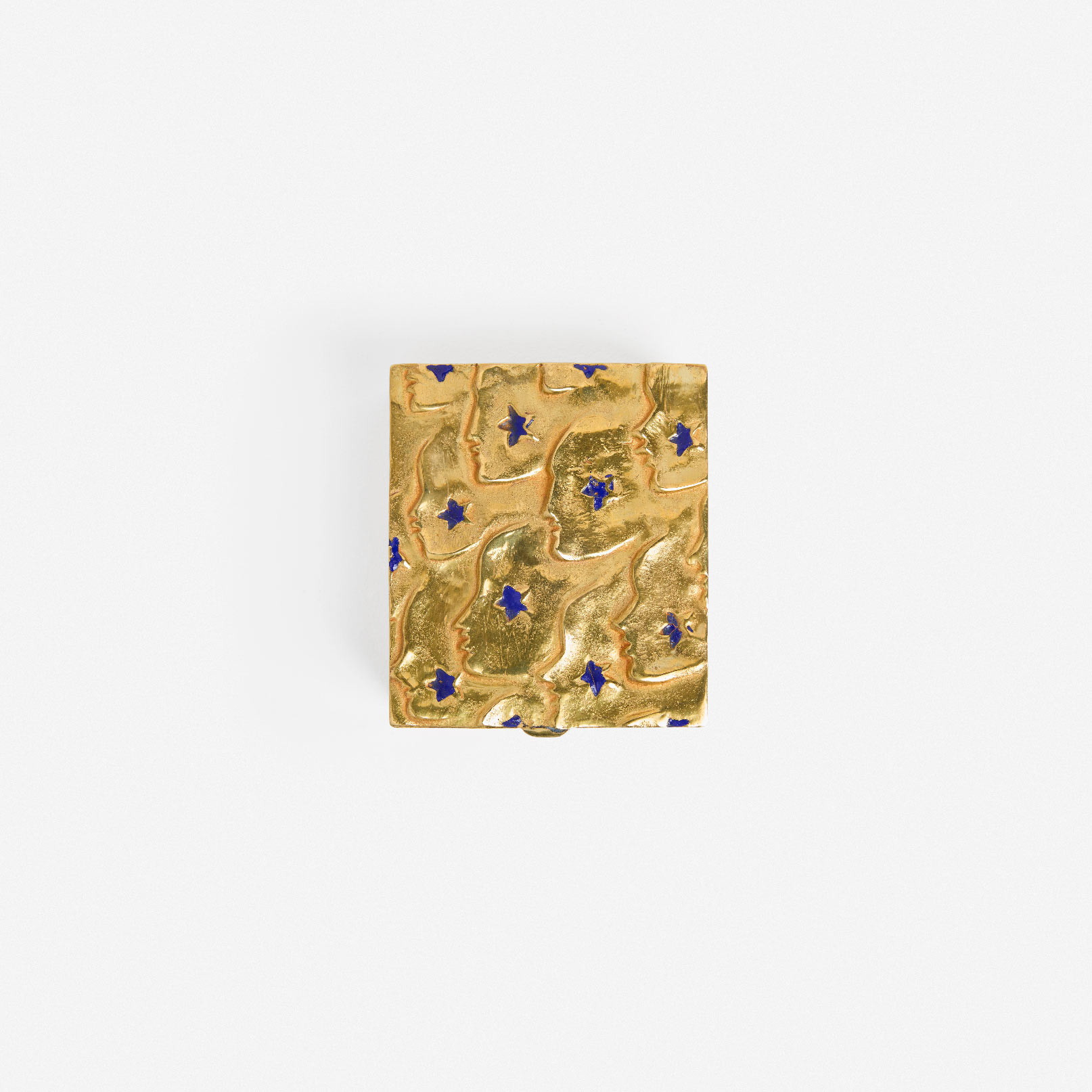 Boîte carrée en bronze doré gravée de visages de profil rehaussés d’étoiles en émail