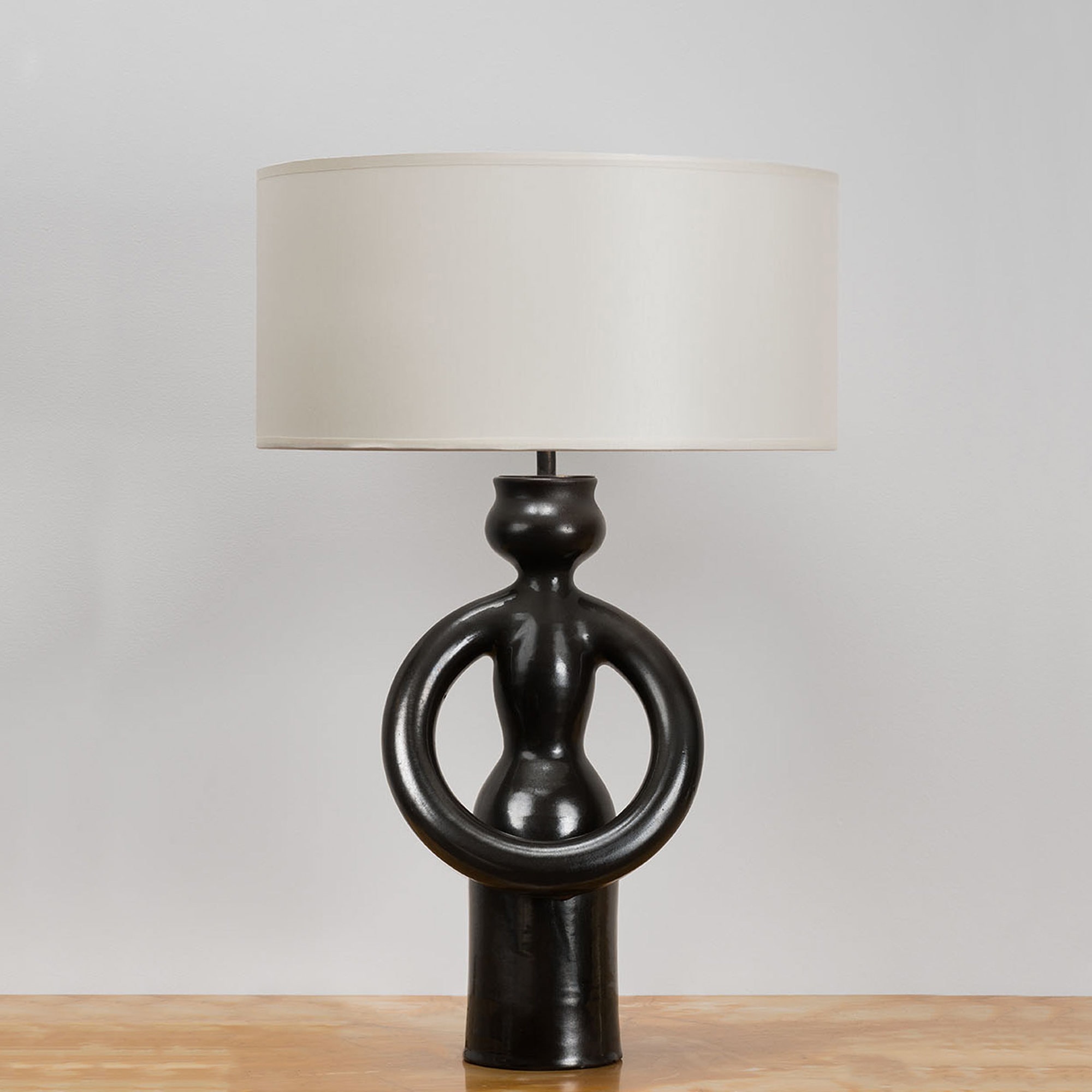 Lampe en céramique émaillée noire de forme anthropomorphe. La lampe est cintrée en son milieu pour dessiner la forme des hanches, puis s’élargit pour créer un buste. Deux bras de chaque côté de la lampe se rejoignent sous les hanches et forment un cercle harmonieux. Au dessus du buste, un cou puis une tête sur laquelle sont fixés la douille et l’abat-jour. Cette lampe a été restaurée à deux endroits. Signée du cachet « Madoura » en creux au dessous.