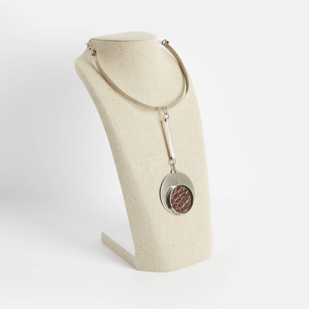 Necklace in silvered metal and brown leather.