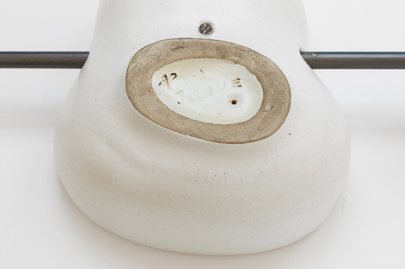 Suite de trois appliques en céramique. Chaque applique est formée d’une pièce à deux lobes concaves, de tailles différentes, en céramique émaillée blanc à effet craquelé noir. A l’intérieur de ces deux lobes un émail de différentes couleurs : vert et bleu canard, vert anis et bleu plus clair, rouge et vert. Ce jeu rythmé de couleurs est mis en valeur par les différentes qualités d’émail, tantôt lisse, tantôt granuleux. La lumière se reflète ainsi différemment. Un cerne noir sur chaque applique épouse les contours de la forme. Chaque applique en parfait état d’origine est signée «Jouve» et du sigle «Alpha» au dos.