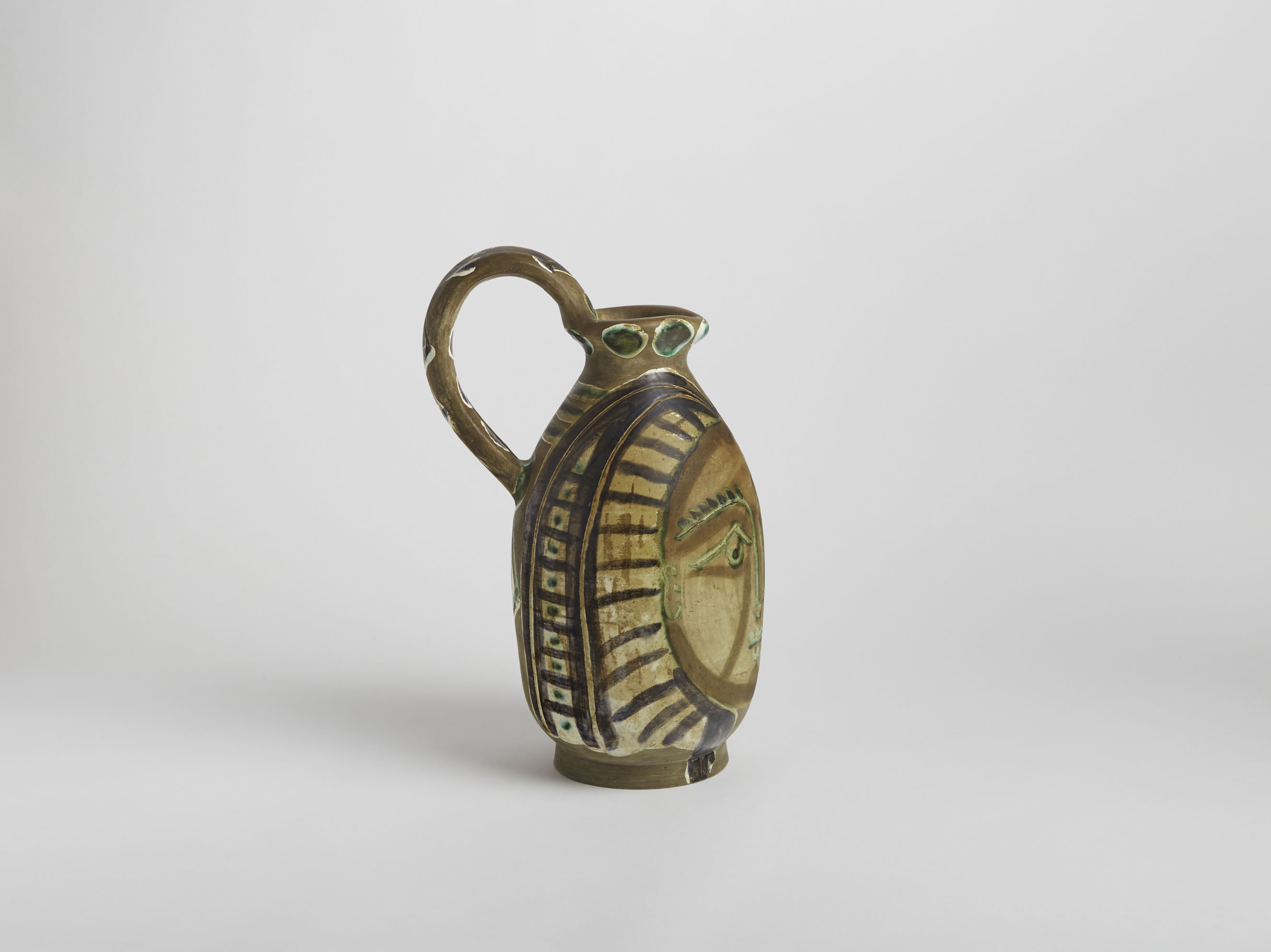 Pichet tourné en faïence blanche, engobe beige, noir, gris et vert, avec décor à gravé au couteau sous couverte partielle au pinceau. Estampillé au revers : Madoura Plein feu et d’après Picasso et inscrit Edition Picasso. Tiré à 500 exemplaires.